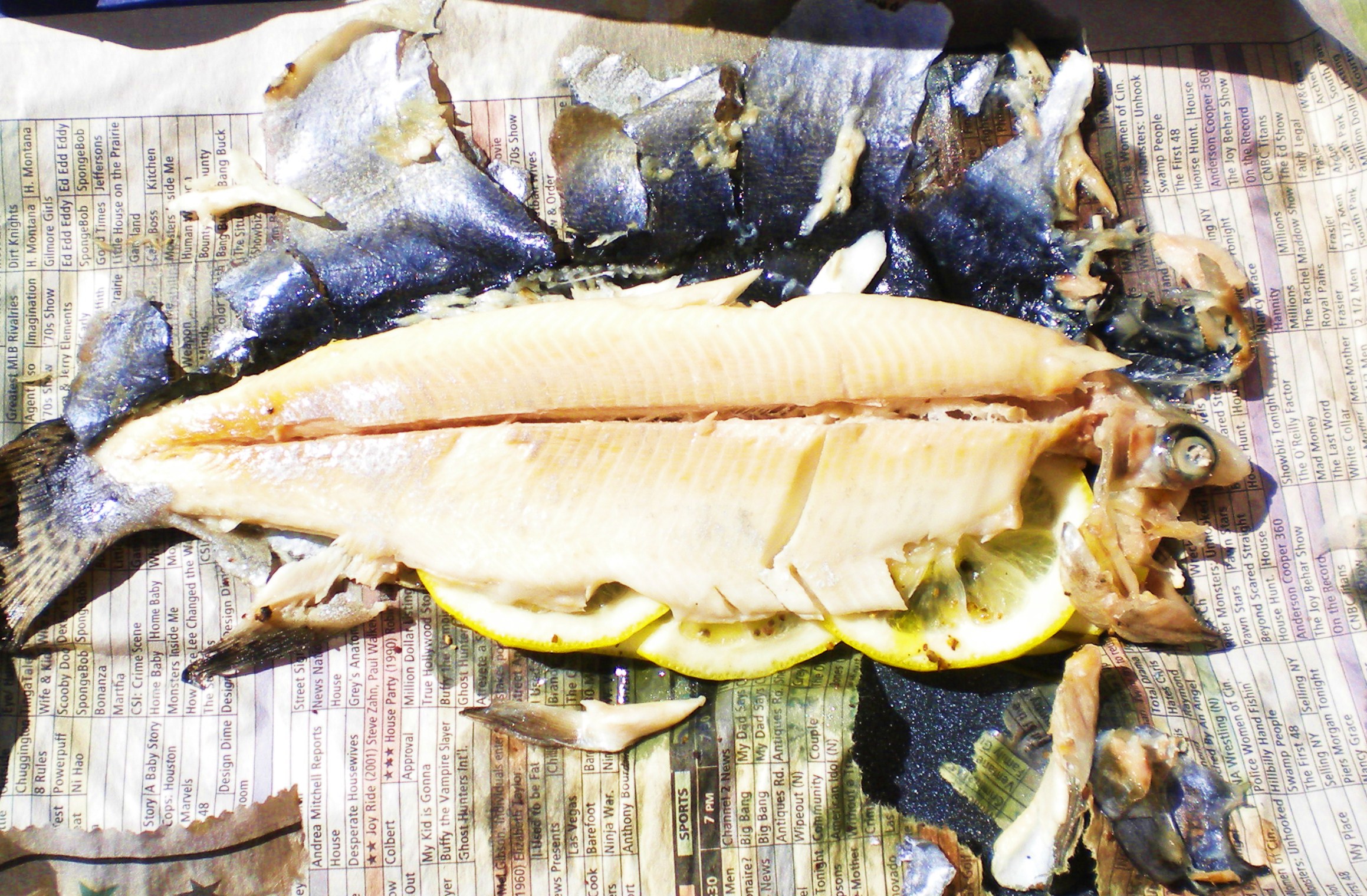 Leave the head behind and using a thin metal spatula, gently remove the body or if you prefer, remove the fillets from the backbone. Newspaper Baked Trout is great served warm with buttery baby new potatoes and something green.
