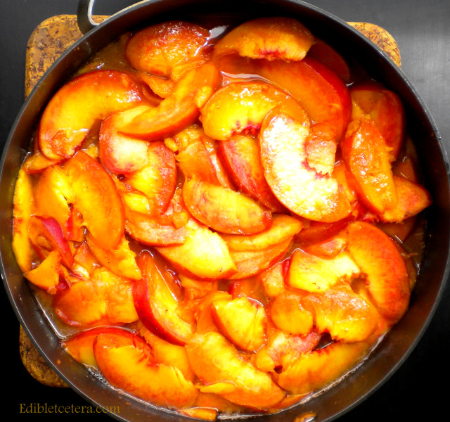 Add the vanilla, cardamom and nutmeg and stir everything for about a minute then add the sliced peaches and gently toss to coat with the buttery sugar/spice mix.