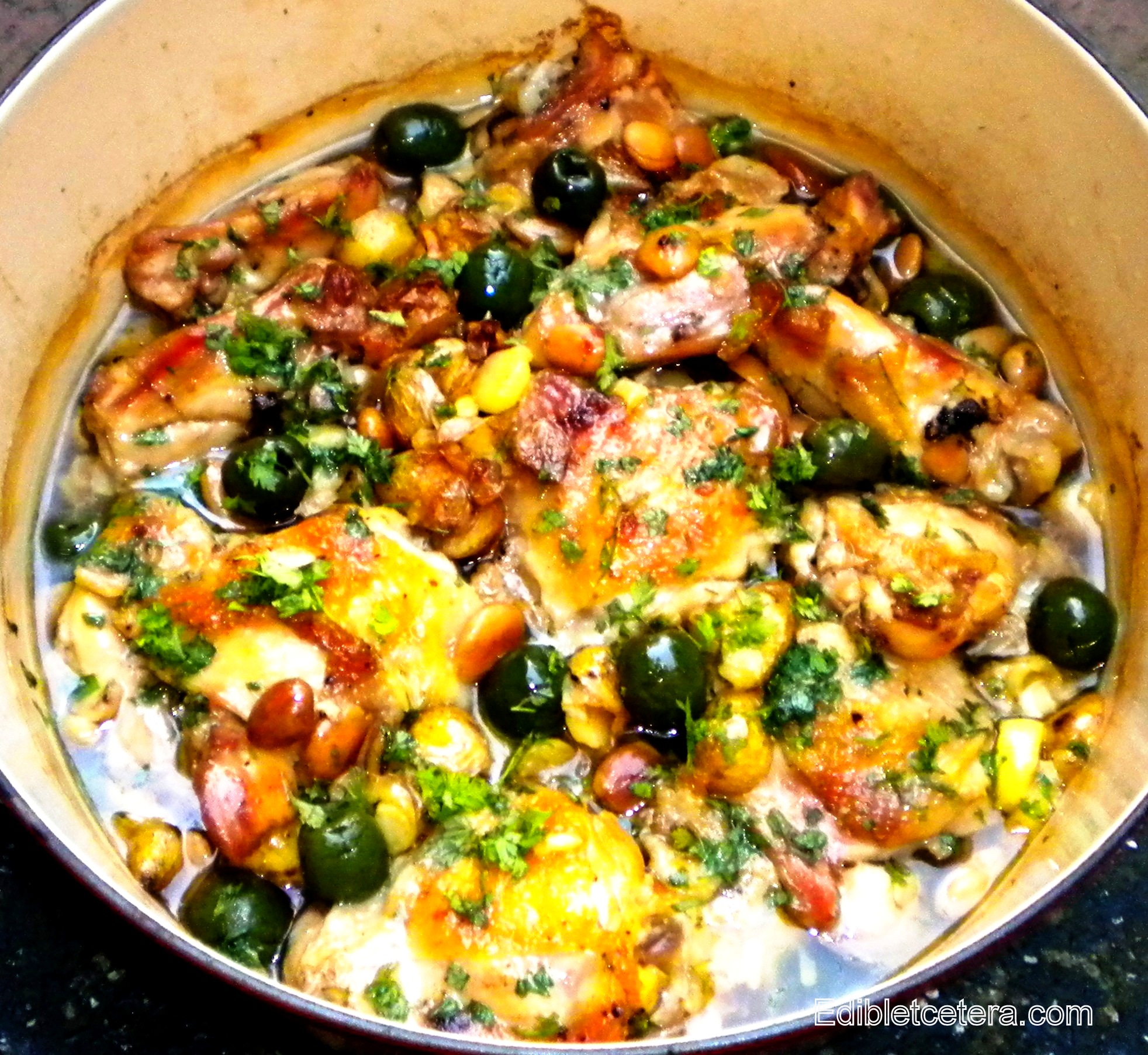 You’ll need to use bone-in chicken thighs with the skin on. These are becoming more and more difficult to find as a result of the growing obsession with a perceived need to cut fat from our diet. (You can find them in Whole Foods, along with the pitted Castelvetrano olives and marcona almonds). You don’t need to eat the skin but because you brown the chicken first, skin is best and the end result will have more flavor.