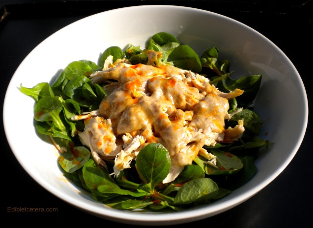 This unusual dish is adapted from a traditional Turkish recipe and is absolutely delicious. Both the chicken and the walnut sauce are served at room temperature so I’m calling it a salad, mainly because I like to serve it over baby mâche lettuce. You can use whatever leafy greens you like.