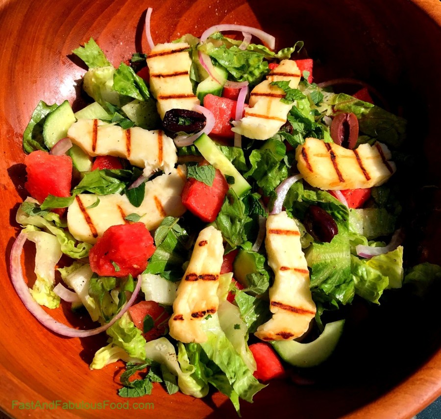 Greek Salad with Watermelon & Grilled Halloumi Cheese