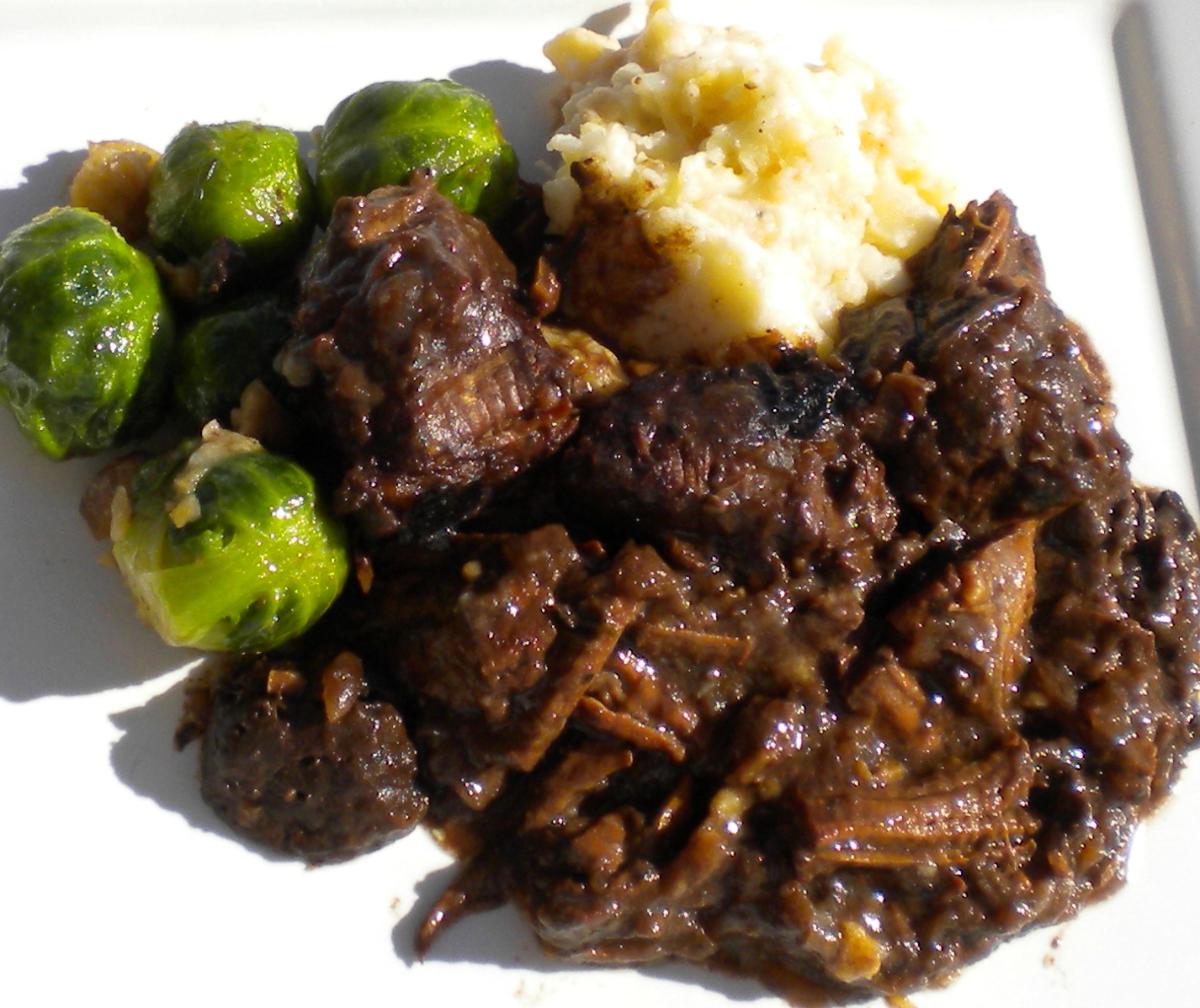 Bring everything to a simmer, put the lid on and stick it in the oven for 3-3 ½ hours; if the meat isn’t wonderfully tender and the sauce isn’t yet dark and rich looking, turn the heat down to 250F (120C) and give it another hour or so. If you’re using a slow cooker you might want to cook it overnight on the lowest setting. Make sure there is enough liquid to cover the meat and if not, just add more Guinness and/or port, at your discretion.